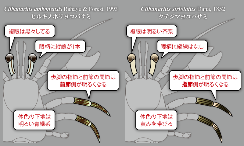 タテジマヨコバサミは、体色は全体的に黄みを帯び明るめの色彩をしているので他のヨコバサミとは区別がしやすい方ですが、希に体色の濃い暗めの個体がおり、ヒルギノボリヨコバサミツメナガヨコバサミ等に似て紛らわしい場合があります。