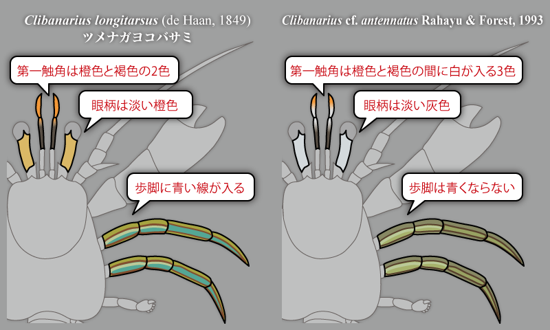 ツメナガヨコバサミは干潟等の汽水域を好み、とても大型になる種です。自然光下では歩脚のブルーのラインが色鮮やかに見えます。沖縄の干潟では本種に混じってClibanarius antennatusも見られます。とても酷似しているので、特徴を比較してみました。