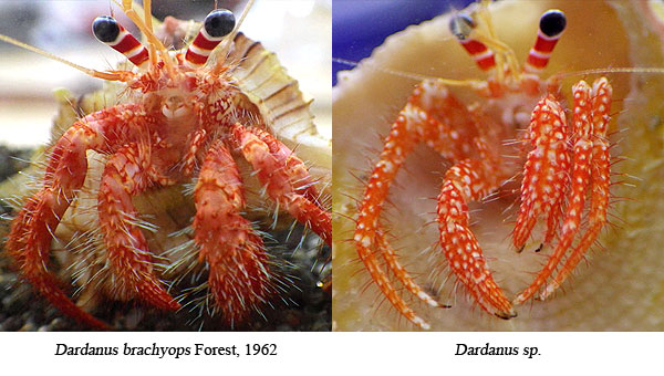 本種は最近までDardanus brachyopsに含めて掲載してましたが、明らかに模様が異なることが判明したため、別種(不明種)として掲載することにしました。本種は当初Dardanus brachyopsの幼体と考えていて、確かに胸脚(鉗脚含む)のオレンジ地に白点の模様は、指節・前節・腕節に限って言えば百歩譲って幼体期の特徴に見えないこともありませんでしたが、とは言えDardanus brachyopsの場合、各長節は薄いピンク地に赤い波紋のような幾何学模様となるため、各長節もオレンジ地に白点模様のままの本種とは異なります。また、Dardanus brachyopsに掲載した個体にも本種と同等の小さな個体がいますが、そちらはしっかり成熟個体と同じ模様であるため、これらの差異は幼体による色彩変異ではないと判断しました。ちなみに、Dardanus brachyopsの幼体は眼(角膜)が大きめですが、本種は同じ小さいサイズでも角膜は小さく眼柄もスリムなので、その点も別種と判定できるポイントだと考えています。