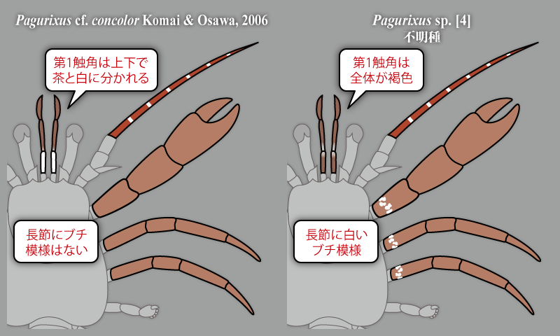 Pagurixus cf. concolorの方は第1触角が褐色と白色に上下で別れますが、Pagurixus sp. [4]の方は全体が褐色で節が少し白っぽくなるだけです。またPagurixus cf. concolorはその名の通り全身が同じ単色ですが、Pagurixus sp. [4]の方は長節に白いブチ模様が入っています。第2触角は両者とも紅白の縞模様です。